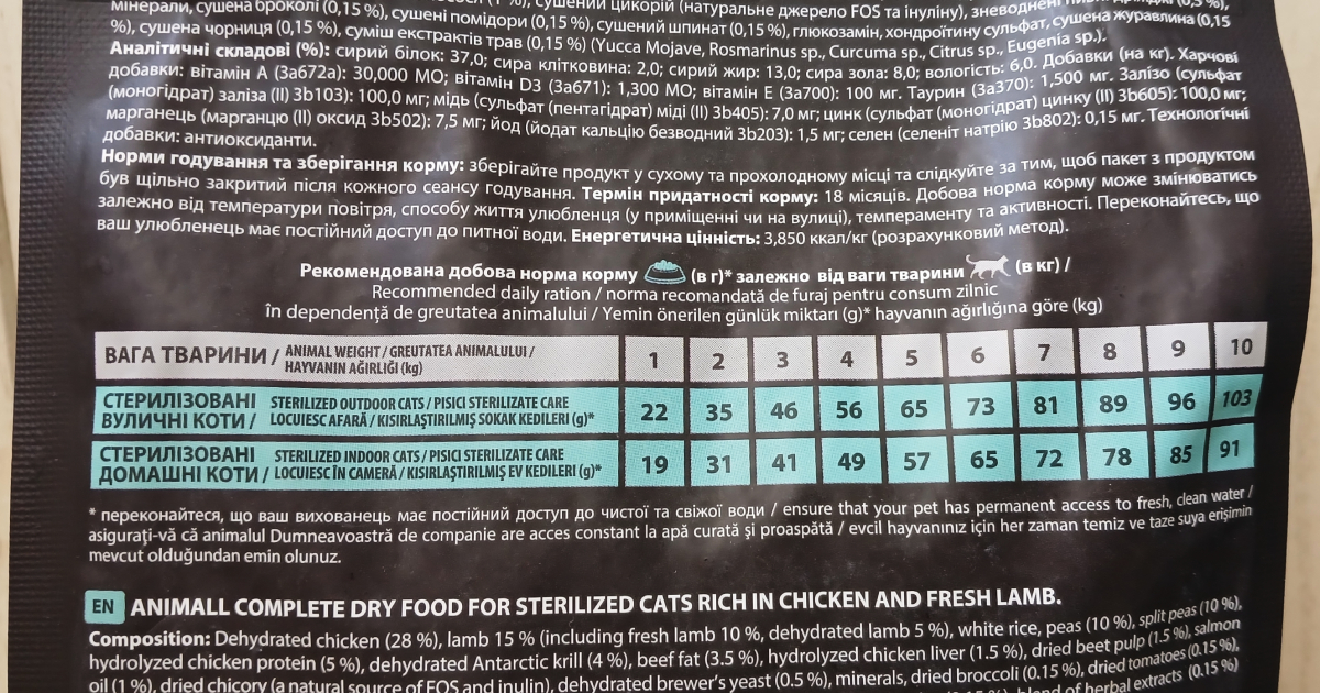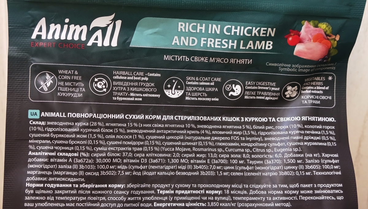 Сухой корм AnimAll с курицей и ягненком для стерилизованных кошек имеет неплохой состав, адекватную цену, приятный аромат гранул и хорошее качество ингредиентов. Однако из-за большого количества гороха корм может вызывать расстройства пищеварения у чувствительных питомцев.