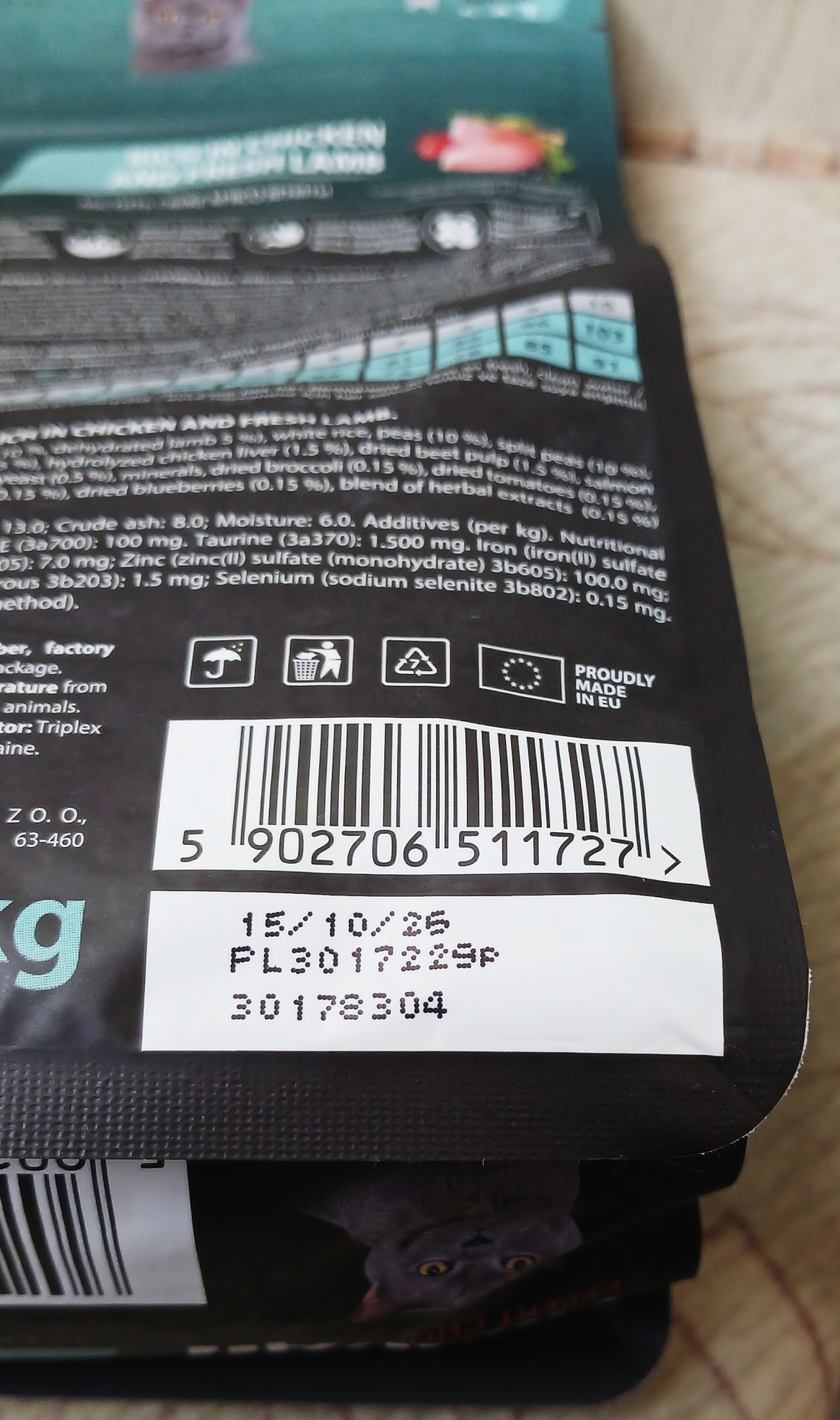 Высокое содержание животного белка (курица и ягнятина 43%), что положительно влияет на мышечную массу и активность кошки.